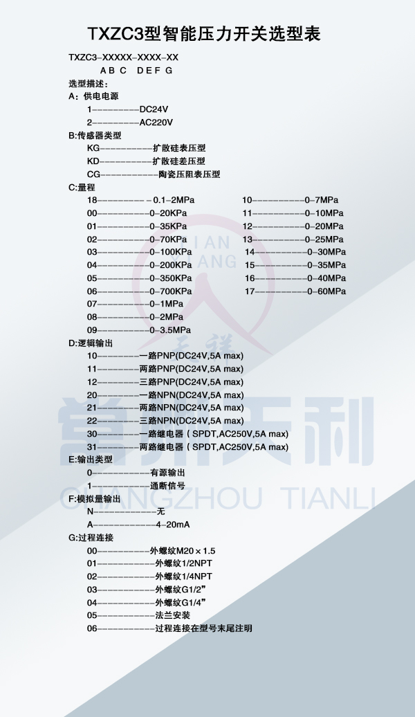TXZC3型智能壓力開關(guān)基本參數(shù)