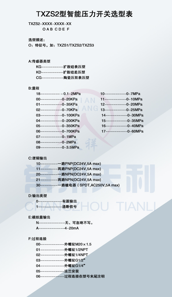 TXZS2智能壓力開關(guān)基本參數(shù)